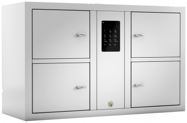 Pro Fach können acht verschiedene Codes programmiert werden. Der Schrank ist in verschiedene Modellen mit 2 bis 6 Fächern erhältlich. Alle Schränke können mit bis zu 15 Expansion-Schränken in beliebigen Kombinationen erweitert werden. So kann ein System über 96 Fächer verfügen, die alle über ein und dasselbe Codeschloss gesteuert werden.